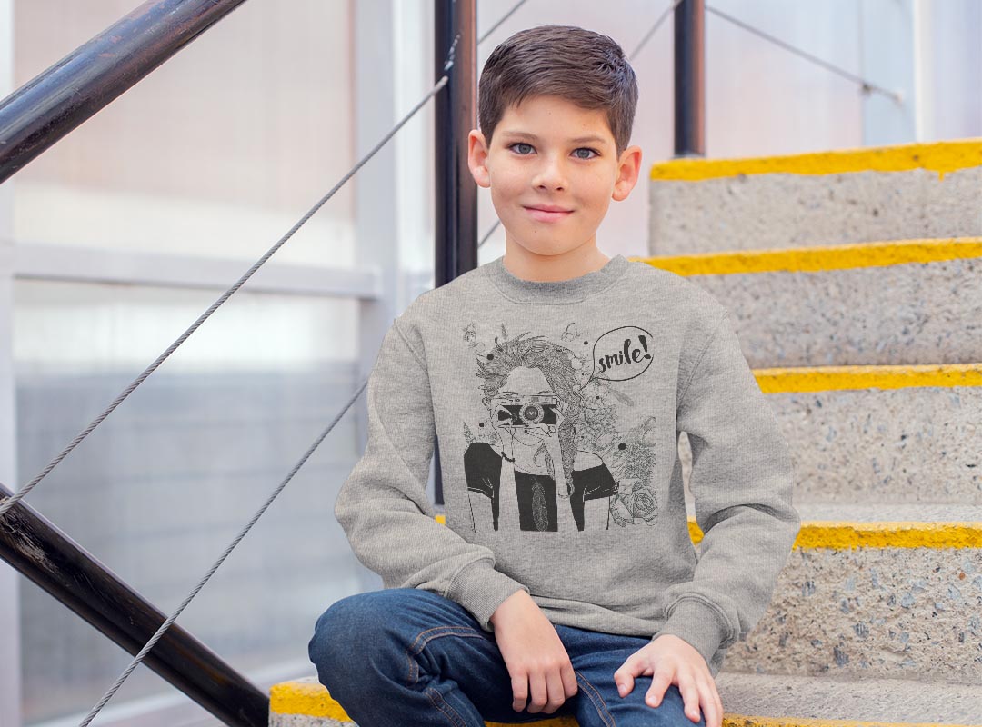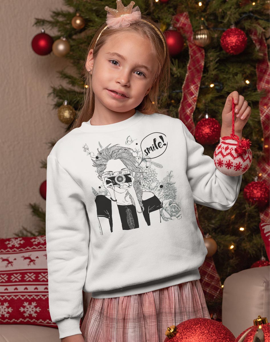 トレーナー キッズ 子供 長袖 ホワイト グレー ブラック デザイン 110 130 150 sweatshirt trainer 白 黒 灰色 裏パイル スウェット スエット 011936 イラスト モノトーン カメラ