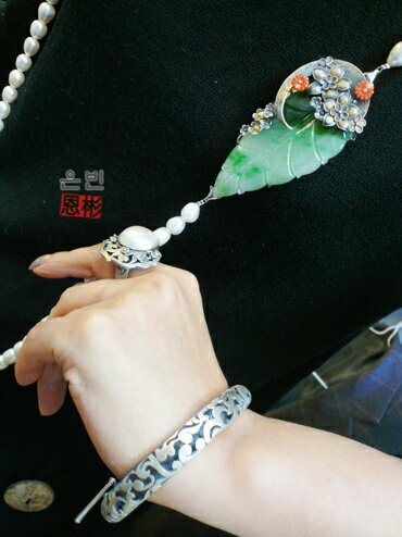 소재; 진주 정은 금부(24k) 전통의 당초문양 안에 반공진주17mm 이상매입 전체size50mm x 49mm 반공진주17mm 이상 with pearl broach RUNNING MODEL 素材;真珠、純銀、金(24k) 伝統の唐草模様を彫り込んだシルバーの台座に 17mmの真珠をm乗せました。