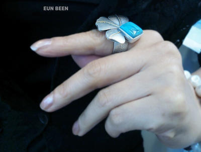 木の葉を添えたスクエア形ターコイズリング ring115 *葉脈部は金 24k ターコイズ トルコ石 アリゾナ産 turquoise 純銀 シルバー silver いぶし処理 * サイズ指定 韓国ジュエリー アクセサリー ジュエリー EUNBEEN 恩彬 ウンビン[送料無料]