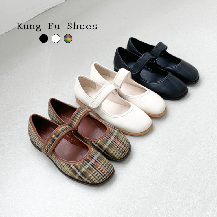 シューズ カンフーシューズ レディース スクエア フラット ストラップ ベルト 黒 ブラック 白 アイボリー チェック 韓国 ファッション