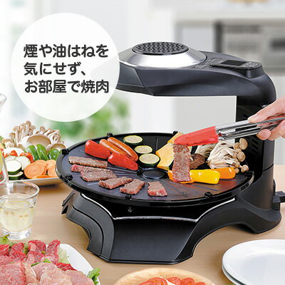 煙を出さず、余分な脂をカットできるグリルが登場! 焼肉や焼き魚、ノンフライ調理もお任せ ・旨味を逃さないダブル加熱(カーボンヒーター&輻射熱) ・傾斜のついたプレートが余分な脂をカット ・揚げ物、焼き物もヘルシーに焼き上がります ・シリコンガードなどの安全設計 ・360度自動回転プレートでムラなく焼けます ・プレート、油受けは丸洗い可能 ・タッチパネルで操作が簡単 サイズ:約W36×D44.5×H30.5cm 重量:約4.8kg 電源:AC100V 50/60Hz 消費電力:1400W 電源コード長さ:約2m 加熱モード:保温・低温・高温 設定可能時間:1〜80分(1分単位) プレート:直径36cm 付属品:電源コード、シリコンガード両面からのダブル加熱で美味しさが違う 煙を出さず、焼肉やお肉も美味しくジューシーに 上部カーボンヒーターの赤外線が食材を直接加熱し、輻射熱でプレートも加熱される「両面加熱」を採用。